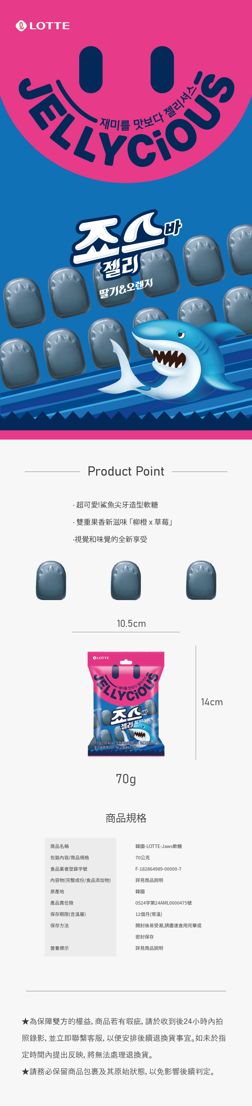 韓國樂天LOTTE 「反差系」零嘴!將軟糖化身鯊魚尖牙造型,神秘海洋藍外觀搭配「軟糖質感」觸感,咬下瞬間卻迸發柳橙×草莓雙果香!,視覺與味覺雙重驚喜!用「意想不到」的創意挑戰你的味蕾極限!