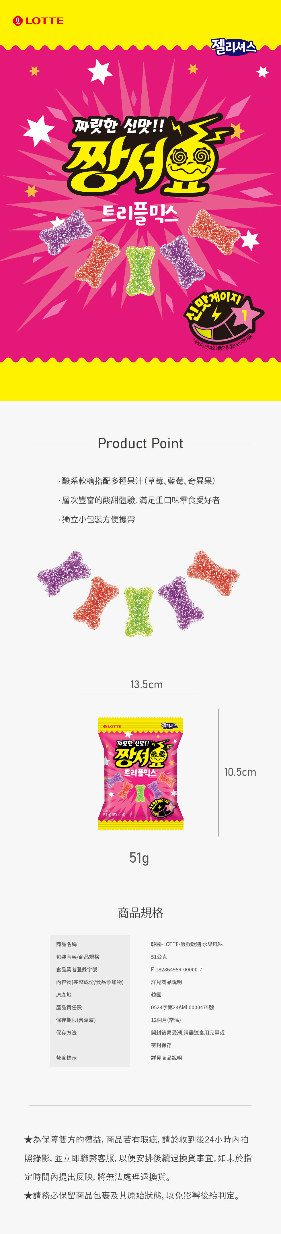 韓國樂天LOTTE人氣酸系軟糖!多種果汁萃取,融合草莓、檸檬、奇異果等酸甜果香,打造層次豐富的「水果酸彈」體驗。軟糖Q彈帶勁,獨立小包裝設計方便隨身攜帶,隨時引爆味蕾!韓國原裝直送,極致酸爽搭配清新果香,追劇、辦公或解饞時刻,一口喚醒活力!